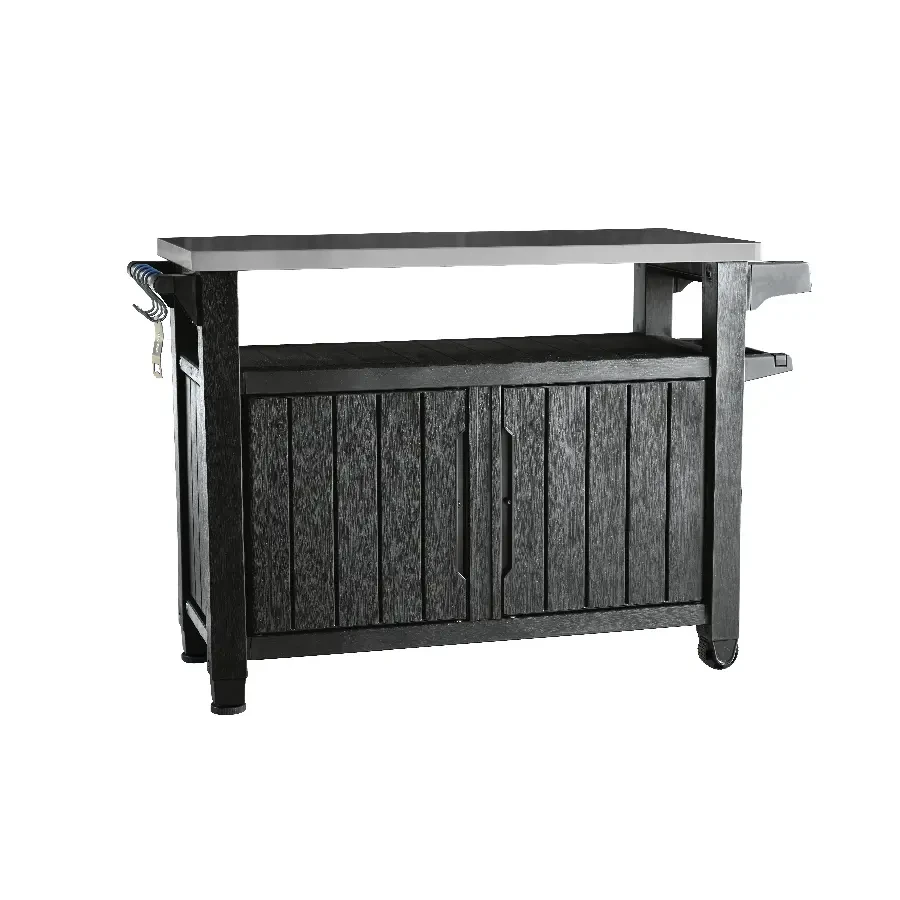 UNITY XL 207 L to nowoczesny, mobilny schowek do zadań specjalnych! Pojemna dwudrzwiowa szafka, wyposażona w funkcjonalny blat ze stali nierdzewnej oraz wygodny uchwyt z haczykami na ręczniki, sprawdzi się podczas dużych, rodzinnych spotkań na tarasie czy w ogrodzie. Z powodzeniem zmieszczą się w niej naczynia, produkty żywnościowe, napoje, akcesoria kuchenne i wiele innych przedmiotów niezbędnych przy organizacji biesiad i grillowych spotkań dla wielu osób.