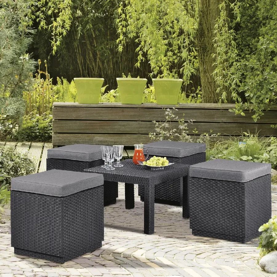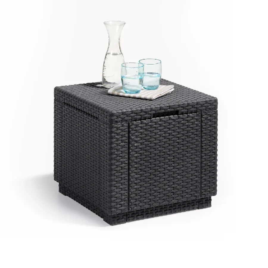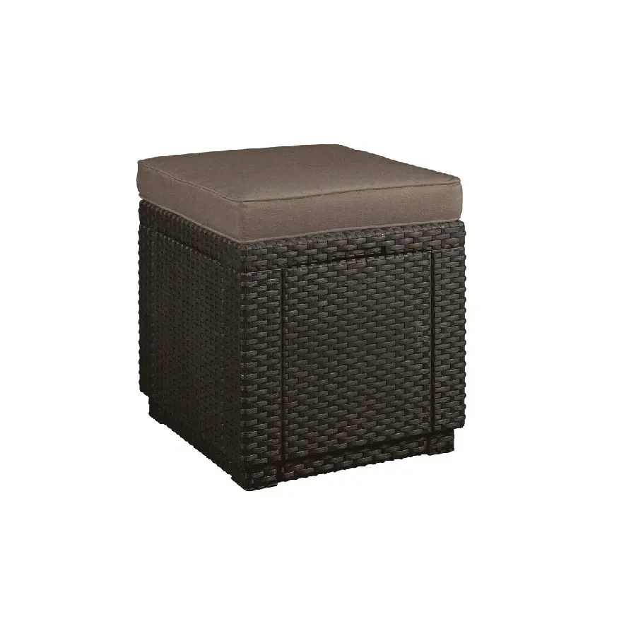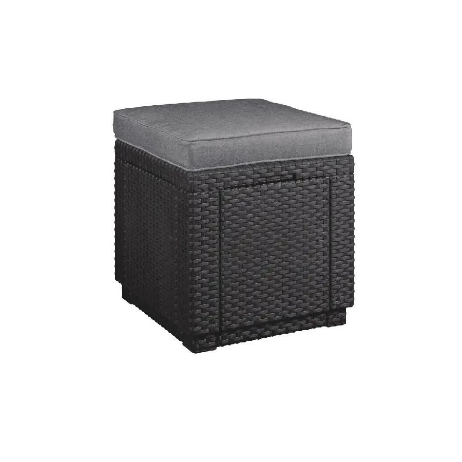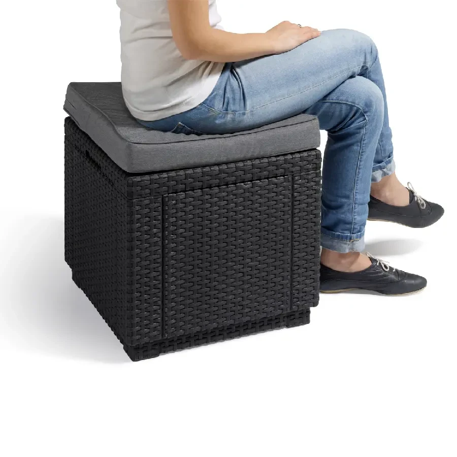 Cube with cushion to oryginalne w swej prostej formie siedzisko z poduszką oraz z dodatkową funkcją schowka. Produkt może służyć zarówno jako siedzenie, stolik czy podnóżek. Ciepła, klasyczna kolorystyka i oryginalna, podobna do rattanowej faktura powierzchni przypadną do gustu nawet najbardziej wymagającemu użytkownikowi. Wykonany z odpornego na promienie UV i warunki atmosferyczne tworzywa. Bardzo łatwy do czyszczenia.