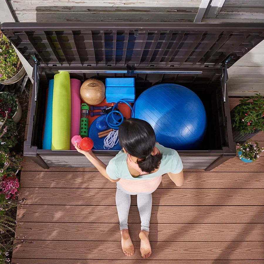W tak pojemnym schowku, jak BRUSH 455 L, umieścisz nie tylko podręczne akcesoria, ale także narzędzia, niezbędne do podjęcia prac ogrodowych, zabawki dla dzieci oraz sprzęt rekreacyjny. Jego największym atutem jest bardzo nowoczesny a zarazem prosty design oraz oryginalna w swym charakterze faktura powierzchni ”wood look”. Wygląd skrzyni do złudzenia przypomina schowek wykonany z naturalnego drewna. Produkt odporny jest na działanie niekorzystnych warunków atmosferycznych. Łatwy w utrzymaniu w czystości.