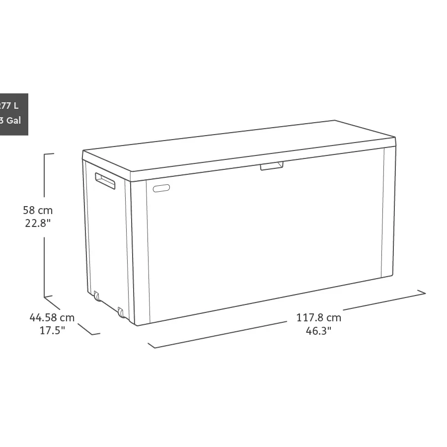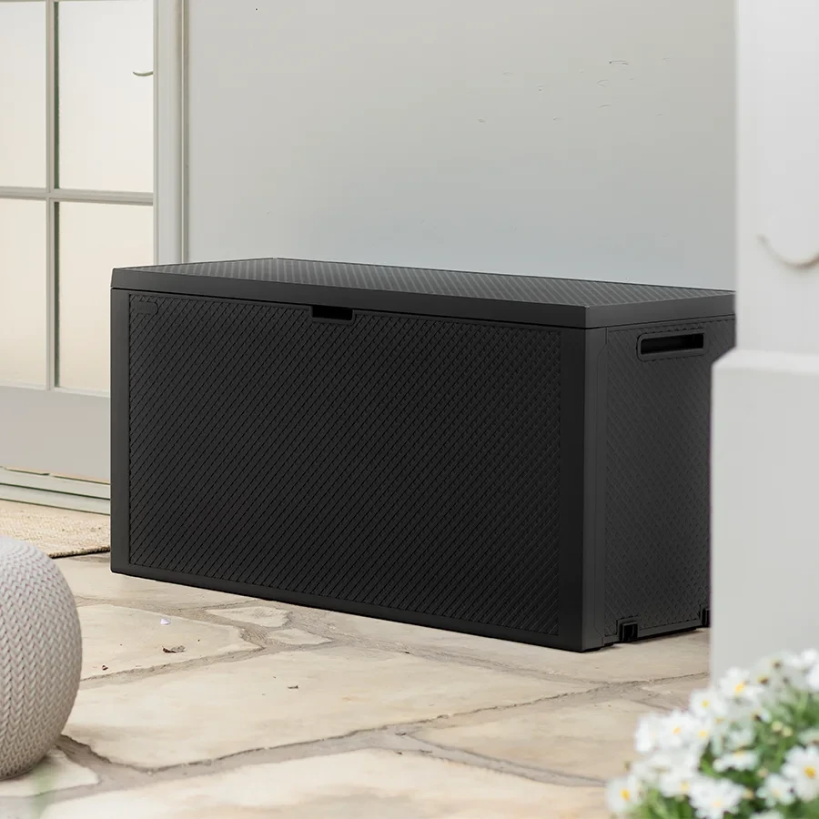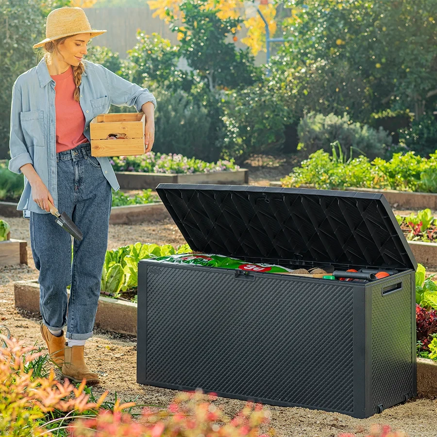 Prostota formy oraz łatwy i szybki montaż to główne atuty uniwersalnej skrzyni Emily 270L. Skrzynia przeznaczona jest do przechowywania różnorodnych narzędzi i akcesoriów ogrodowych, poduszek oraz zabawek dziecięcych. Nowoczesna stylistyka i klasyczna kolorystyka umożliwiają dopasowanie skrzyni do każdego wystroju ogrodu. Świetnie komponuje się z zestawami meblowymi Linii Emily. Jest to także idealne rozwiązanie na taras czy patio.