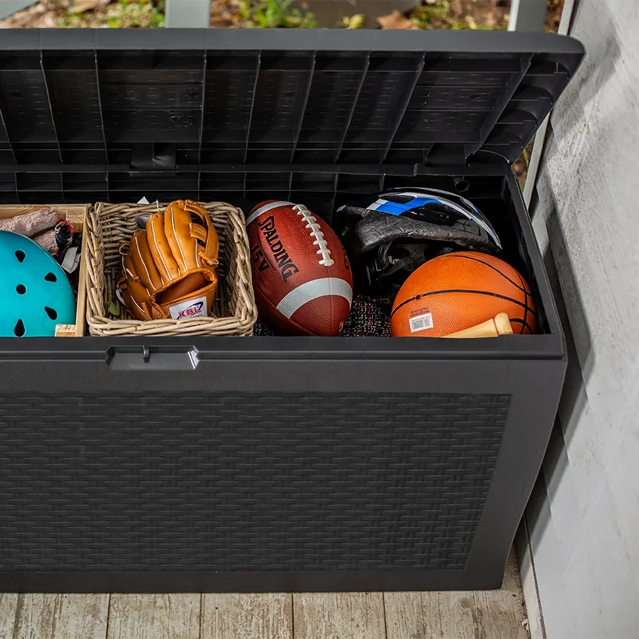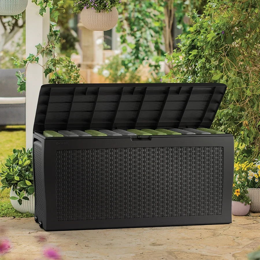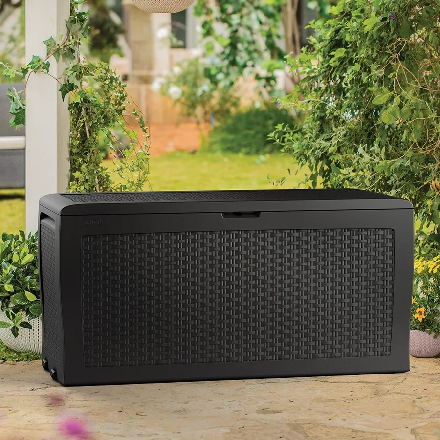 Doskonały schowek na poduszki i akcesoria ogrodowe. Mocna i wytrzymała skrzynia, pięknie zaprojektowana i estetycznie wykończona. Faktura powierzchni przypominają naturalny splot rattanowy. Odporna na szkodliwe warunki atmosferyczne i promieniowanie UV. Nie wymaga konserwacji. Wbudowane uchwyty i rolki ułatwiają przemieszczanie nawet przy wewnętrznym obciążeniu schowka. Łatwy i szybki montaż – bez użycia narzędzi. Produkt bardzo łatwy w utrzymaniu w czystości.