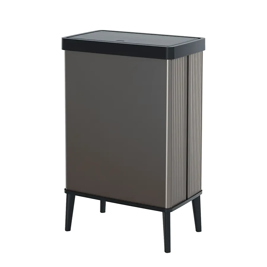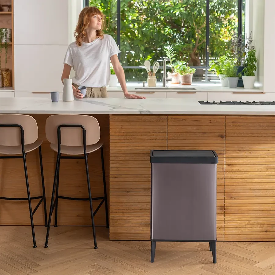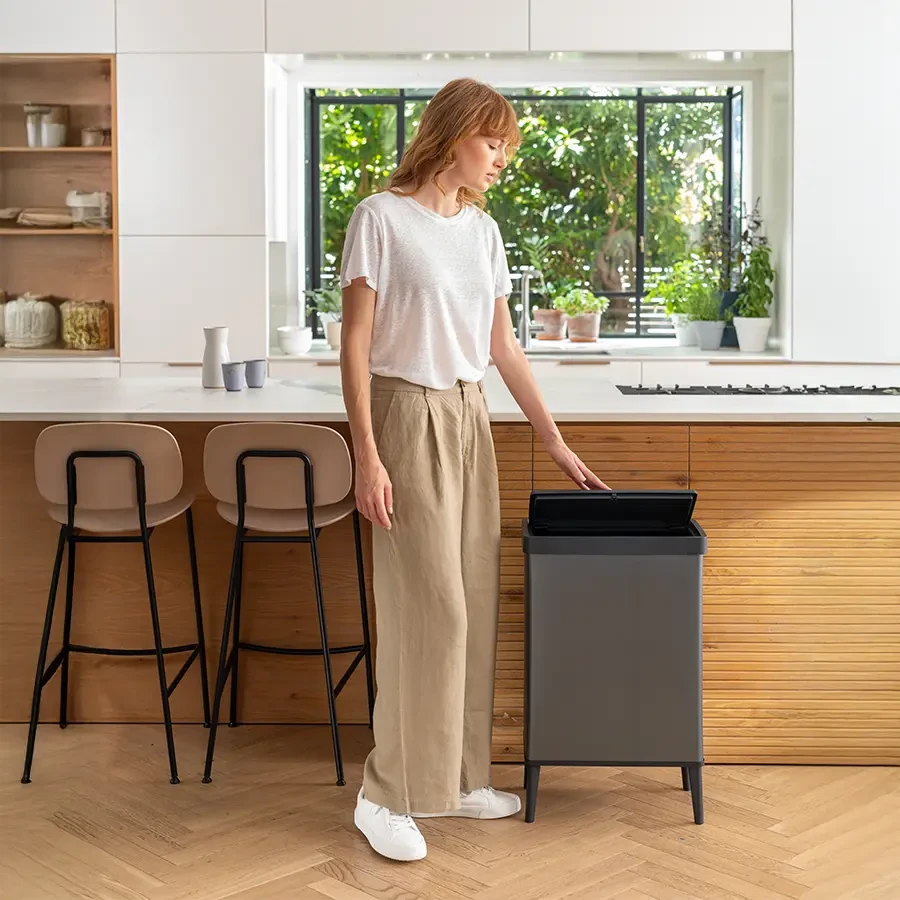 Kosz ma pojemność 54L i szeroką pokrywę z funkcją otwierania za pomocą dotyku, a worek na śmieci można dyskretnie ukryć wewnątrz. Wysokie nóżki zapewniają dodatkową przestrzeń pod koszem, ułatwiając sprzątanie, a także umożliwiają wygodną obsługę bez konieczności schylania się.