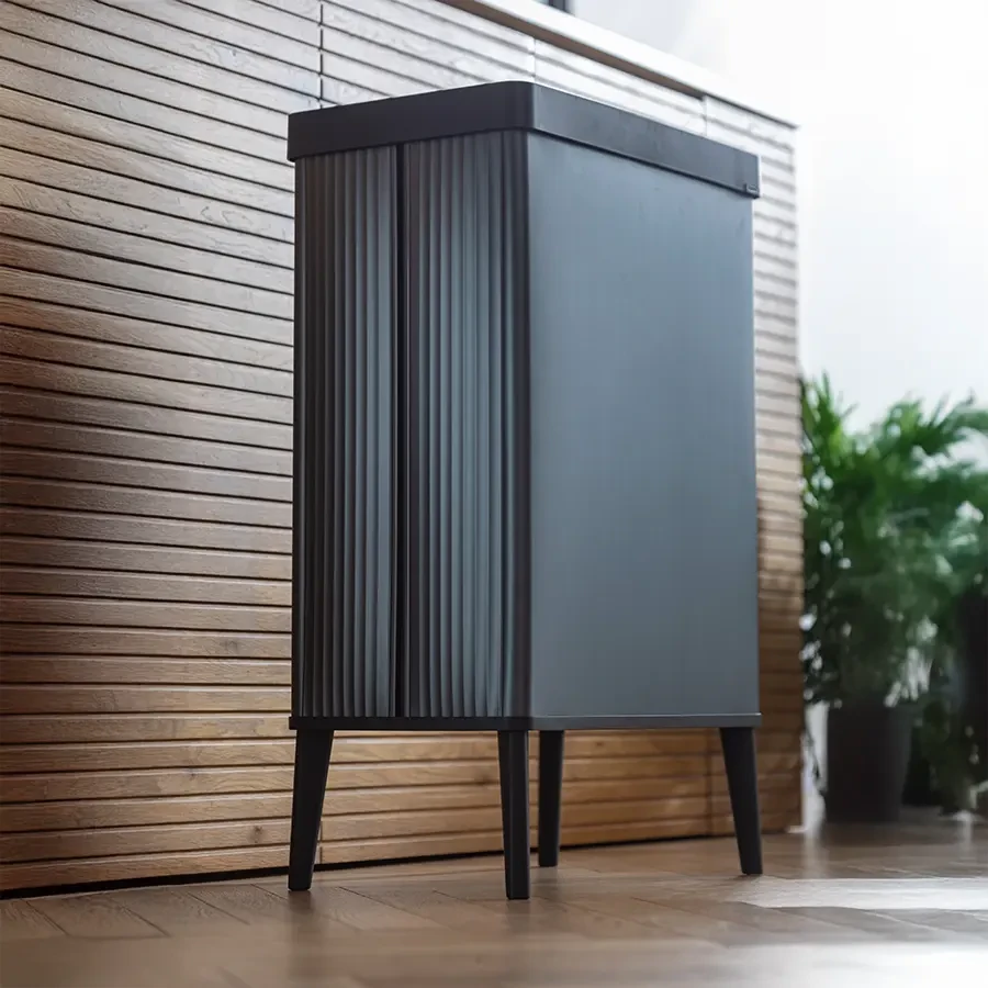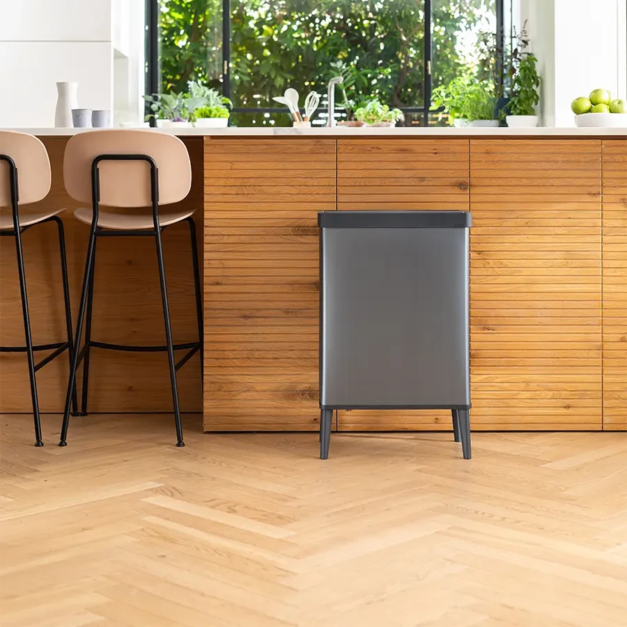Kosz ma pojemność 54L i szeroką pokrywę z funkcją otwierania za pomocą dotyku, a worek na śmieci można dyskretnie ukryć wewnątrz. Wysokie nóżki zapewniają dodatkową przestrzeń pod koszem, ułatwiając sprzątanie, a także umożliwiają wygodną obsługę bez konieczności schylania się.