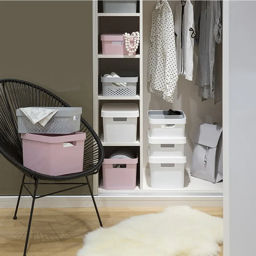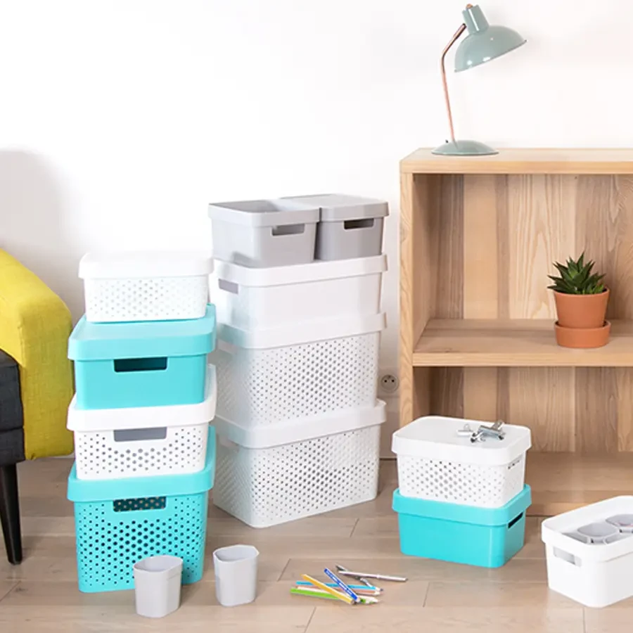 Pojemniki Infinity Recycled to uniwersalne rozwiązanie do przechowywania, które pozwala na łatwe uporządkowanie rzeczy w całym domu. Dzięki nowoczesnemu i minimalistycznemu wykończeniu, inspirowanemu stylem skandynawskim, pojemnik pasuje do każdego wystroju wnętrz. Dzięki wygodnym uchwytom, pojemnik jest łatwy do przenoszenia z jednego miejsca na drugie. W celu zapewnienia ochrony przed kurzem, pojemnik wyposażony jest w pokrywę, która zapewnia bezpieczne przechowywanie przedmiotów. Możliwość sztaplowania i ustawiania jeden na drugim pozwala na efektywne przechowywanie nawet w małych pomieszczeniach, a modułowe kształty umożliwiają wiele sposobów składowania. Pojemniki Infinity Recycled są łatwe do czyszczenia i wykonane w 100% z tworzywa sztucznego pochodzącego z recyklingu, co czyni je przyjaznymi dla środowiska.