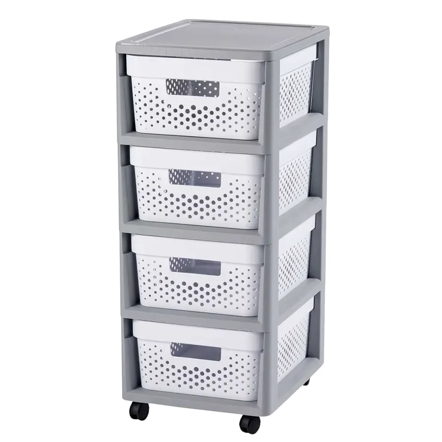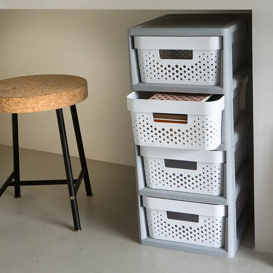 Regał Infinity to wielofunkcyjne rozwiązanie do przechowywania, które będzie doskonale pasować do Twojego wnętrza. Znajduje zastosowanie w każdym pomieszczeniu, gdzie potrzebne jest dodatkowe miejsce do przechowywania. Ten stylowy regał został zaprojektowany z myślą o użytkownikach, którzy cenią sobie funkcjonalność i estetykę. Posiada 4 wyjmowane pojemniki, które pozwalają na wygodne przechowywanie różnych przedmiotów. Nowoczesne i proste wykończenie inspirowane stylem skandynawskim pasuje do wielu różnych aranżacji wnętrz. Wygodne uchwyty zapewniają łatwe wysuwanie szuflad, a kółka ułatwiają transport regału. Regał Infinity jest również łatwy w czyszczeniu, co sprawia, że utrzymanie go w czystości jest łatwe i szybkie. Co ważne, regał jest wykonany z co najmniej 70% tworzywa pochodzącego z recyklingu, co czyni go przyjaznym dla środowiska.