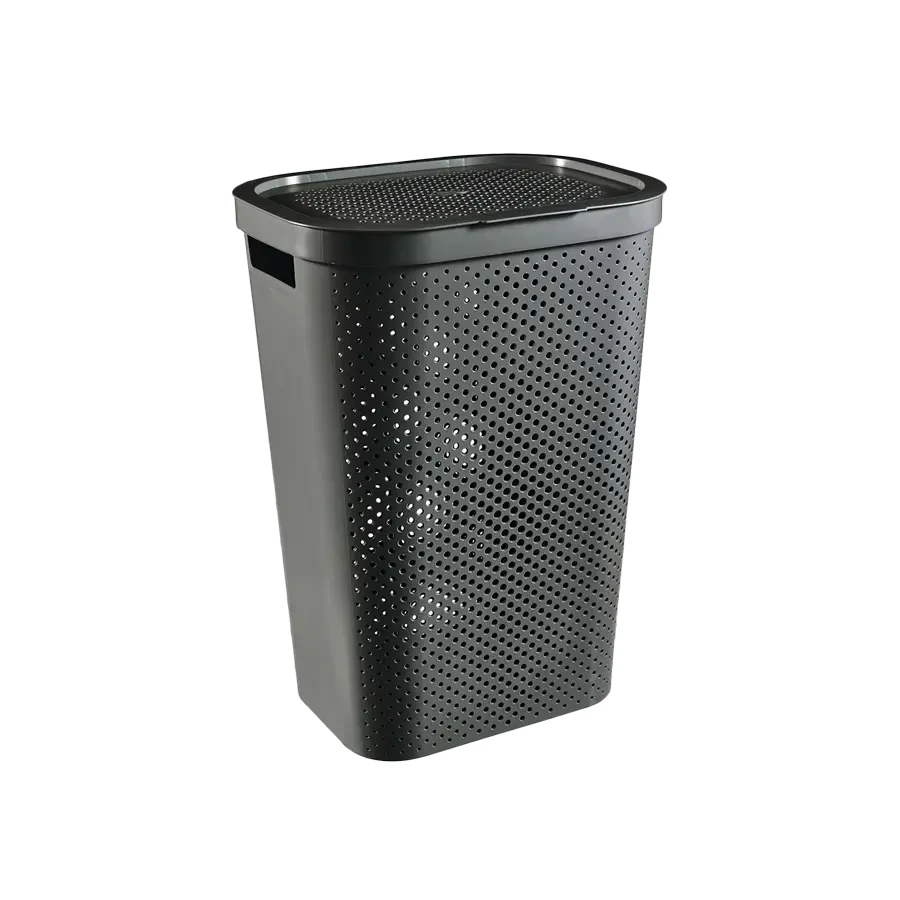 Kosz na pranie Infinity o dużej pojemności 60 litrów. Charakteryzuje się ponadczasową prostotą i minimalizmem, inspirowany skandynawskim stylem dodaje odrobinę nowoczesności każdej łazience, sypialni czy pomieszczeniu gospodarczemu. Posiada dwa ergonomiczne uchwyty, które ułatwiają przenoszenie z jednego miejsca do drugiego. Odchylana pokrywa zapewnia wygodne i praktyczne otwieranie, dzięki czemu możesz łatwo napełniać i opróżniać kosz. Dodatkowo, jego ażurowa konstrukcja zapewnia ciągły przepływ powietrza, co zapobiega powstawaniu nieprzyjemnych zapachów. Wykonany jest w 100% z tworzywa pochodzącego z recyklingu, jest niezbędny w każdym domostwie, gdzie ceni się ekologię!