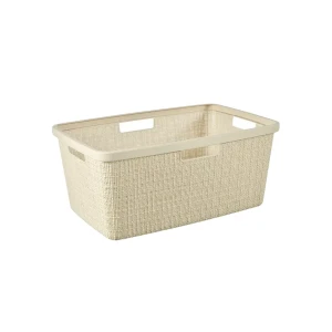 Uniwersalny kosz na pranie Jute 46 l jest idealny do przechowywania w sypialni, łazience czy pomieszczeniu gospodarczym. Unikalny wzór, inspirowany splotem tkaniny z włókien naturalnych, dodaje mu uroku i charakteru. Wyposażony w cztery wygodne uchwyty, jest łatwy do przenoszenia. Kosz wykonany jest w minimum 70% z tworzywa pochodzących z recyklingu, dzięki czemu to również ekologiczne rozwiązanie dla Twojego domu.