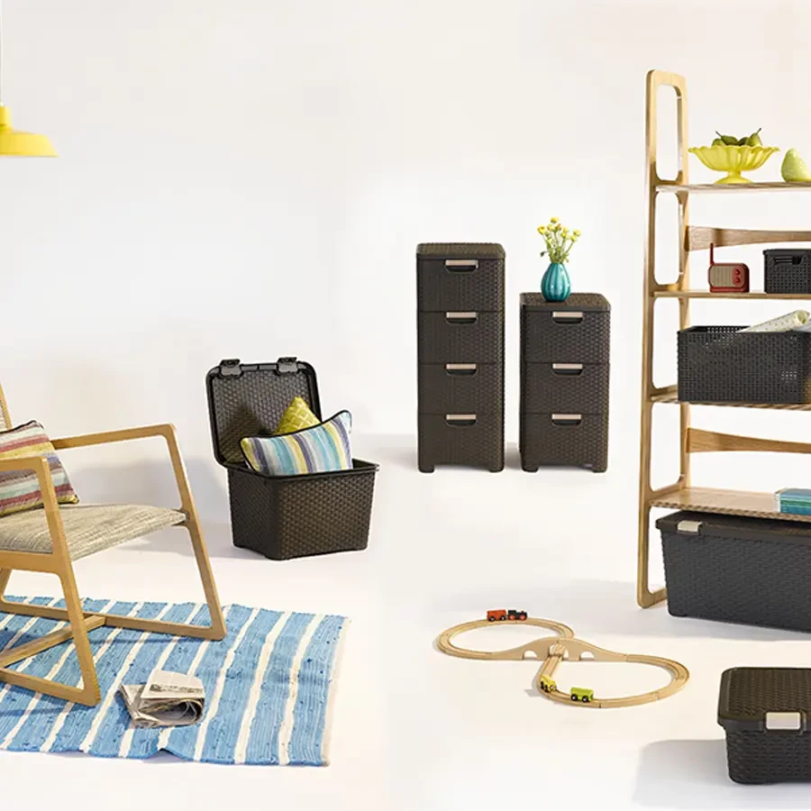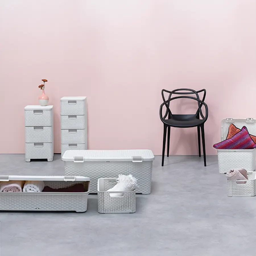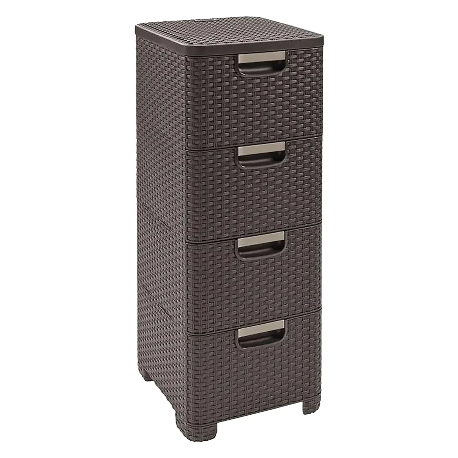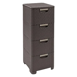 Praktyczny regał o nowoczesnym designie przyda się w każdym domu. Posiada cztery pojemne szuflady z uchwytami, które są wytrzymałe i co najważniejsze bardzo łatwe w czyszczeniu. Regał idealnie sprawdzi się łazience, sypialni czy w roli kontenera przy biurku. Wysokiej jakości materiał, z którego jest zrobiony przypomina w swojej strukturze popularny rattan, który idealnie wpisuje się w każdy wystrój wnętrz.