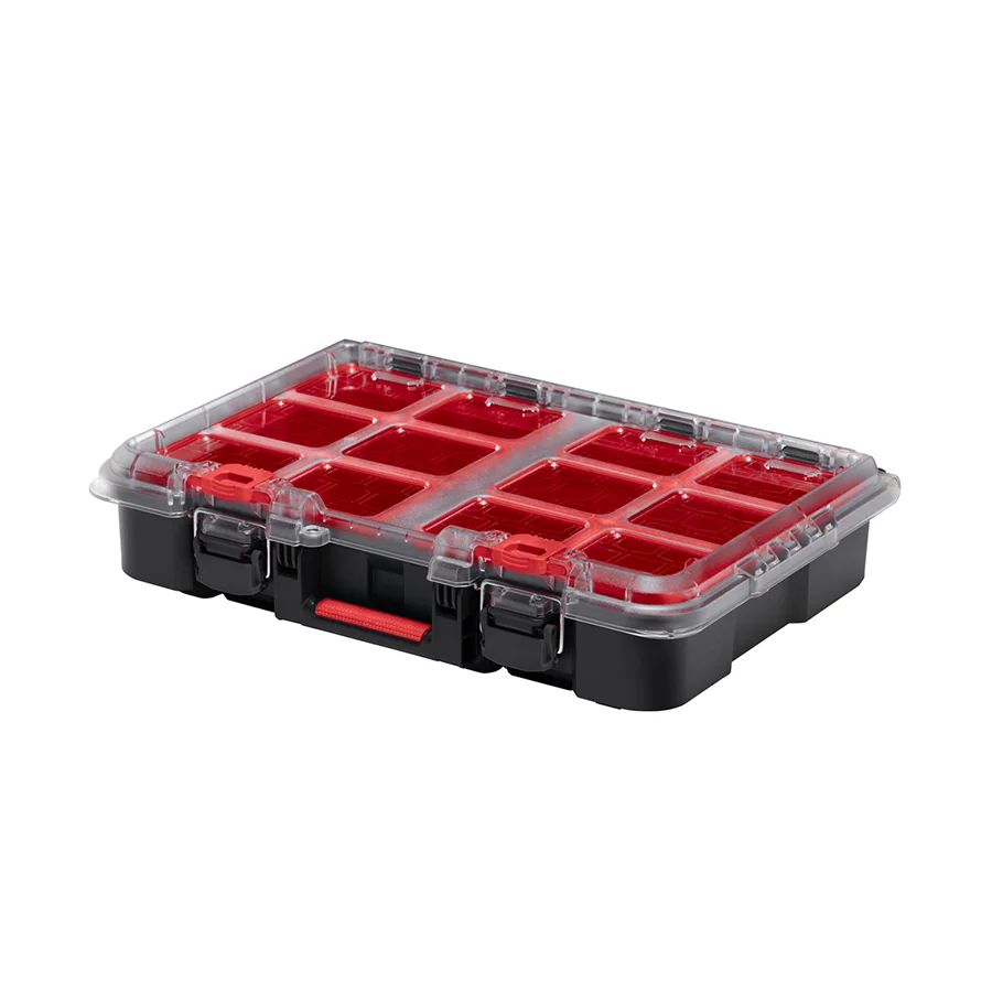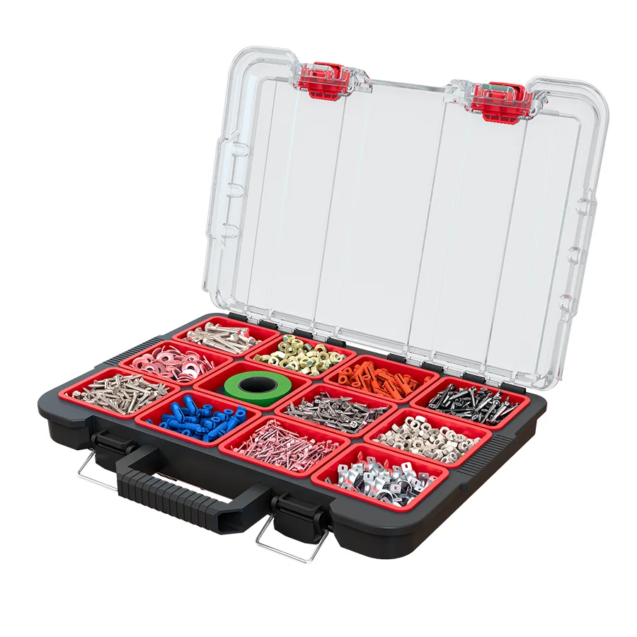 ‚Lekki i poręczny organizer z serii Stack’N’Roll został zaprojektowany z myślą o najbardziej wymagających majsterkowiczach. To znakomite rozwiązanie dla miłośników praktycznych rozwiązań. Doskonale sprawdzi się w każdym garażu czy przydomowym warsztacie, ułatwiając utrzymanie idealnego porządku w miejscu pracy. Organizer wykonany został z wysokiej jakości tworzywa, co zapewnia mu dużą wytrzymałość oraz odporność na przypadkowe uszkodzenia mechaniczne. Wewnątrz znajduje się aż 10 pojemnych i praktycznych przegródek, które znakomicie nadają się do przechowywania różnego rodzaju śrubek, gwoździ, wkrętów oraz innych drobnych akcesoriów narzędziowych. Solidnie wykonany organizer wyposażony został w ergonomiczną rączkę, umożliwiającą jego komfortowe przenoszenie. Przezroczysta poliwęglanowa pokrywa oraz zapięcie na mocne zatrzaski, skutecznie zabezpieczają znajdujące się w nim przedmioty. Najwyższa jakość tworzywa w połączeniu z solidnym wykonaniem, zapewniają wieloletnią trwałość produktu.